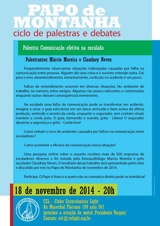 Como reduzir o risco de acidentes causados por falhas na comunicação entre escaladores? Como aumentar a eficácia da comunicação nessa situação? Não percam palestra de Márcio Moreira e Claudney Neves!